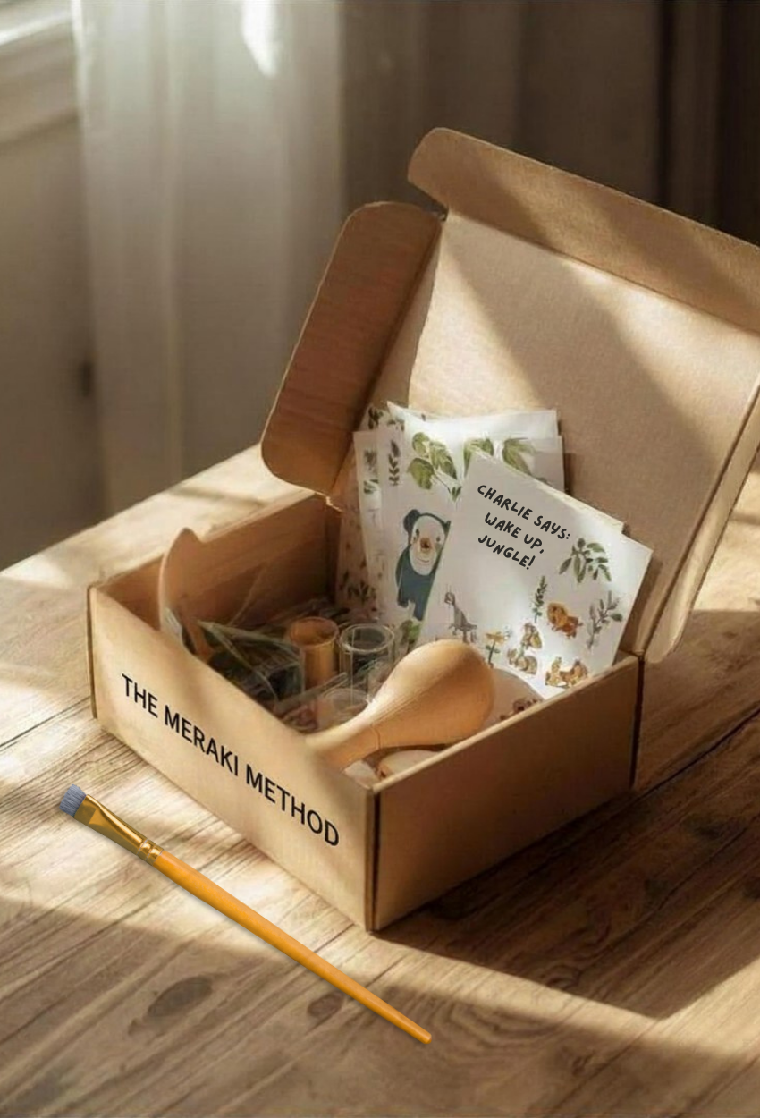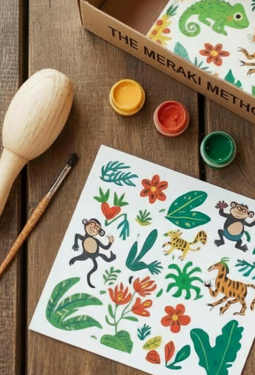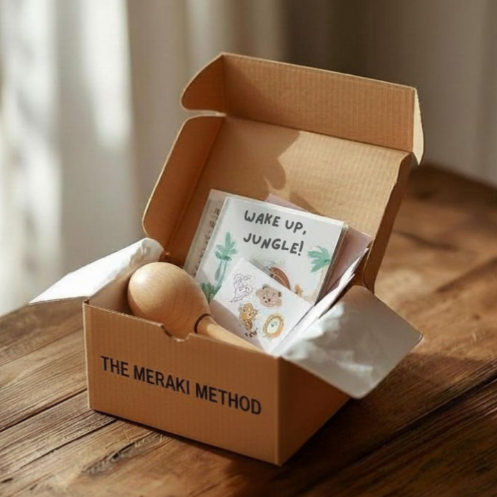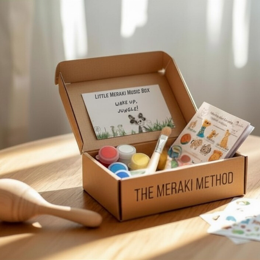 Our Little Meraki Music Box is a guided, play-based musical experience designed to help young children explore rhythm, sound, and connection at home. ‘Wake Up, Jungle’ is the first in our Little Meraki Music Box series and engages children through rhythm, sound and movement. They learn while having fun!
